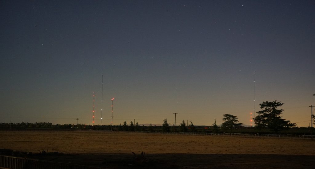 The first thing my wife heard me say was “I’m a Leo, so I don’t believe in astrology.” She’s a Scorpio, and that’s her constellation, above another of my affections, the Walnut Grove tower farm in California’s central valley. Left to right, the towers are 2,049, 2,000, 1,549, 524, and 1,997 feet tall and transmit all of Sacramento’s TV stations. Happy Valentines Life
