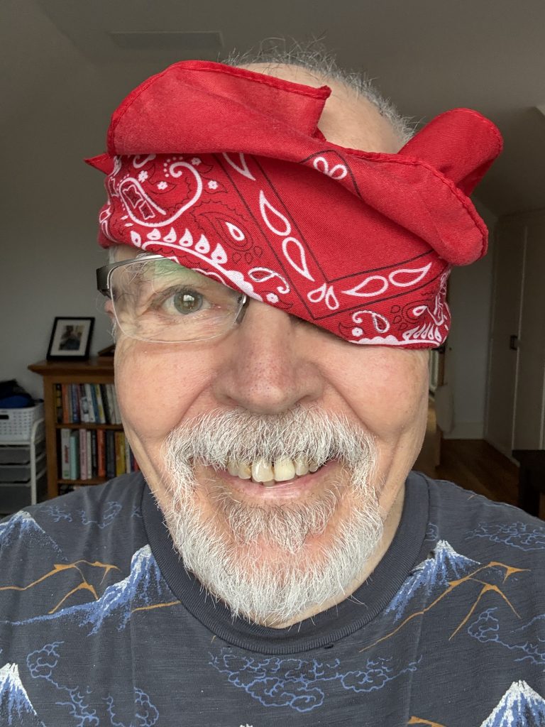 Anyway, the surgeon had to turn his emulsifying machine up to 9 (normal is 3) to demolish the old brown lens. This, plus the antiquity of my eyeball, caused the cornea to swell and turn gray, so the world to my left eye is now just colors and shapes. If all goes according to plan, this will gradually clear up. Meanwhile, no driving, no lifting heavy things, and hopefully no new regrets.