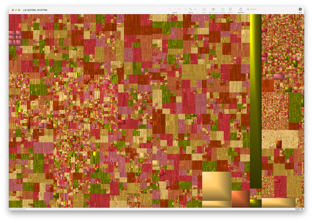 A GrandPerspective map of my laptop’s hard drive. The vertical green block is Apple Photos. The large yellow blocks are videos I neeeded to offload to an external movie drive. Lots of smaller ones had to go too.