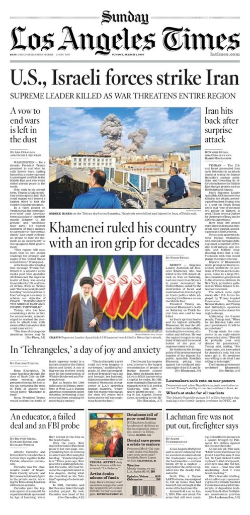 The front page of today’s Los Angeles Times. I can read it, because I subscribe. I also recommend that everyone subscribe to newspapers, because facts still matter to those troubled entities, regardless of how screwed their business is.