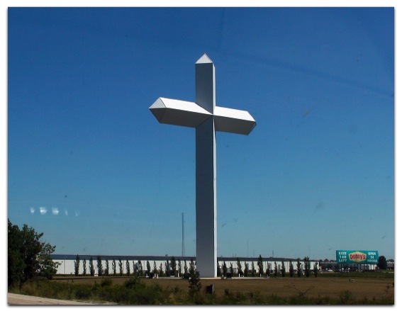 About an hour into Southern Illinois after watching St. Louis’ Gateway Arch recede from our rear-view mirrors, we were met along Interstate 70 by an even more surreal giant totem: a white cross, rising oddly out of a field next to the highway and behind a bunch of industrial buildings. So we shot a bunch of pictures of it and kept on trucking. Later I looked up giant cross 70 illinois and found Effingham, Illinois – Giant Cross, at RoadsideAmerica.com: