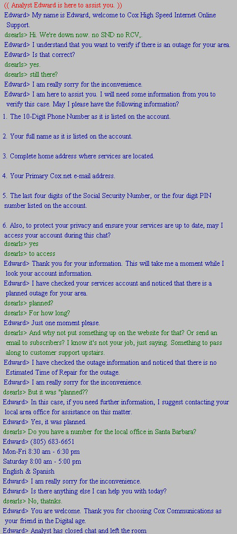 So one happened today. Fortunately I have a borrowed Sprint EvDO card here. (My Verizon one won’t work on my newer laptops.) I just checked and it gets 1.096Mps down, 533Kbps up. Not bad, considering. Anyway, I used that connection to get on the Cox service website and eventually found a chat interface. I wanted to copy and paste the text, but the interface doesn’t allow that. So I took a series of screen shots and put together the whole dialog as a .jpg, leaving out the personal info that it asked for. Speaks for itself: