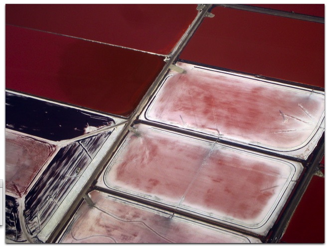 These are a few among the many salt ponds that ring the south end of San Francisco Bay. Once considered and agricultural innovation and an economic boom, the practice of “reclaiming” wild wetlands for industrial purposes is now considered ecologically awful by environmentalists, especially here on the West Coast of the U.S., which has precious few wetlands in any case. Many environmentalists have been working to get Cargill to close the ponds and return the Bay to its more natural state. Cargill hasn’t budged. In fact, <a href=”http://www.cargill.com/sf_bay/saltpond_ecosystem.htm”>Cargill has its own views</a> on the matter, plus some interesting facts about the ponds themselves.