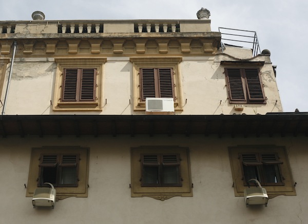 When your building dates from the 13th century and has walls made of thick stone blocks (and that’s probably what’s under the stucco here), you do the best you can on a room-by-room basis. The shot above is of the only three window AC units in a building that had many more windows than you see here. At some point the thinking becomes, “Hey, if you want to cool off, ride a scooter or buy some gelato.”