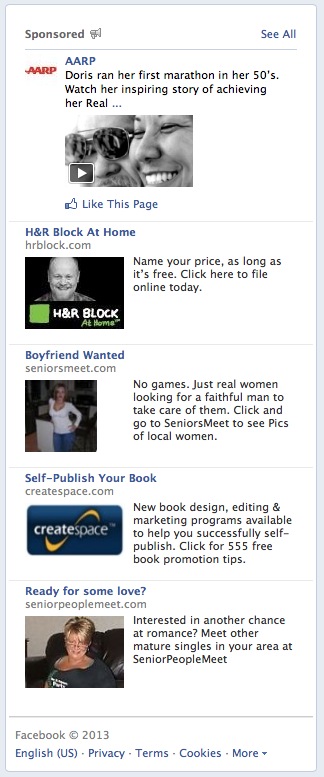 Maybe it’s because they’ll sell anything to anybody. Or maybe it’s that SeniorPeopleMeet and SeniorsMeet simply buy exposures across the entire “senior” demographic, regardless of what Facebook’s intelligence might say about individuals in that demographic. Clearly Facebook doesn’t mind, regardless of the reasons, which is worse than insulting: it’s stupid and wrong.