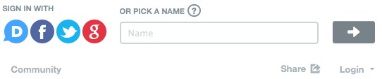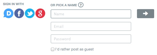 First I picked Disqus (the one on the left), but it didn’t work. Then I picked Twitter. That didn’t work. (It flashed a small page that said “Redirecting you back to the application,” plus some other stuff that disappeared before I could read it.) Then I started writing in a name, and new fields opened up: