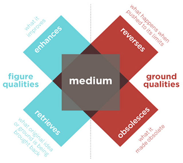 The problem here, however, is the tendency we have to get caught up in effects. While those are all interesting, the McLuhans want us to look below those, to causes. This is hard because effects are figures, and causes are grounds: the contexts from which figures arise. From Marshall and Eric McLuhan’s Media and Formal Cause (Neopoesis, 2011): “Novelty becomes cliché through use. And constant use creates a new hidden environment while simultaneously pushing the old invisible ground into prominence, as a new figure, clearly visible for the first time. Every innovation scraps its immediate predecessor and retrieves still older figures; it causes floods of antiquities or nostalgic art forms and stimulates the search for ‘museum pieces’.”