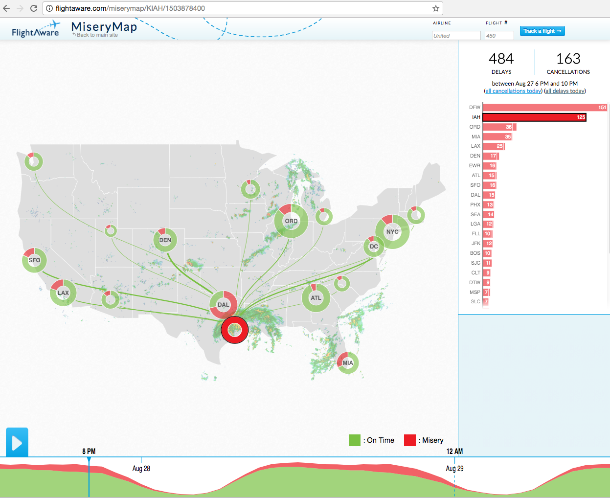 Look at aviation, for example. Houston is the 4th largest city in the U.S. and George Bush International Airport (aka IAH) is a major hub for United Airlines. For the last few days traffic there has been sphinctered down to emergency flights alone. You can see how this looks on FlightAware’s Miserymap: