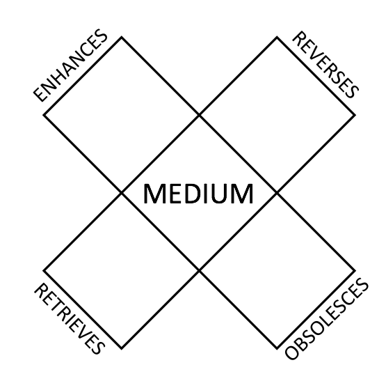 Chief among the laws Marshall and Eric minted is the tetrad of media effects. (A tetrad is a group of four.) It says every medium, every technology, has effects that refract in four dimensions that also affect each other. Here’s a graphic representation of them: