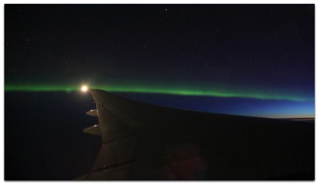 Normally on transatlantic flights between Europe and the U.S., one looks north at the aurora, but in this case I was looking south, because we veered north to avoid headwinds on the direct route, which would have taken us over the southern end of Greenland, right under that aurora. The whole flight was close to 12 hours, went in a large crescent loop, and at the end had us coming down at Los Angeles along the Pacific Coast, roughly from the direction of Seattle: