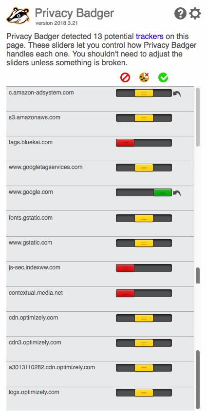 For one among many views of what’s going on, here’s a compressed screen shot of what Privacy Badger showed going on in my browser behind Zeynep’s op-ed in the Times: