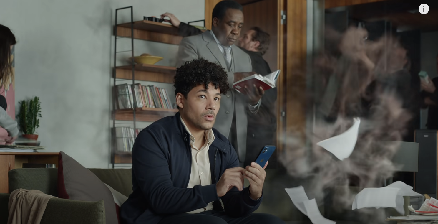 If you haven’t seen it yet, watch Apple’s Privacy on iPhone | tracked ad. In it a guy named Felix (that’s him, above) goes from a coffee shop to a waiting room somewhere, accumulating a vast herd of hangers-on along the way. The herd represents trackers in his phone, all crowding his personal space while gathering private information about him. The sound track is “Mind Your Own Business,” by Delta 5. Lyrics: