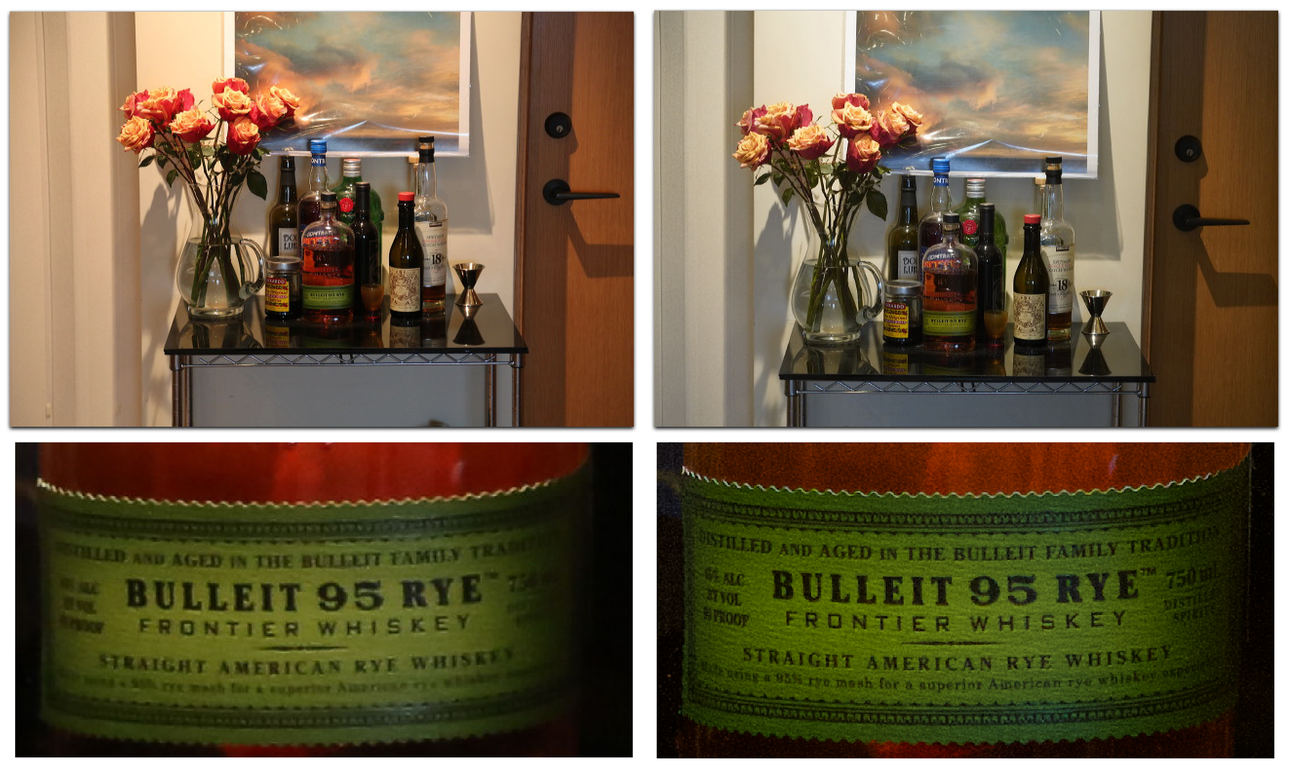 On the top left is a photo taken with my trusty old (also much used and abused) Canon 5D Mark III. On the top right is one taken by a borrowed new Sony a7Riii. Below both are cropped close-ups of detail. The scene is in a room illuminated by incandescent track lighting. It is not an art shot, though it does contain photo art by our good friend Marian Crostic, whose Sony a7R she is kindly remanding to my custody tomorrow. (Her main camera is now an a7Riii like the borrowed one I used here.)