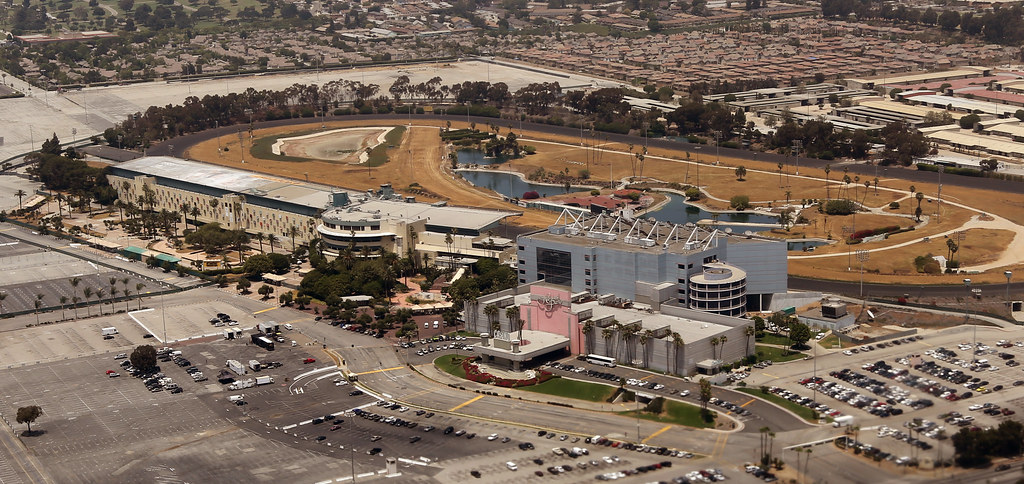 Everything still appears operative. You can even see horses practicing on the dirt track. Also note The Forum across the street on the north side. Now the Kia Forum, its roof at various times also bore Great Western and Chase brand images. It was built in 1966 and is still going strong. During its prime, the Lakers in their Showtime era played there. (The team moved downtown to Staples Center in 1999.)