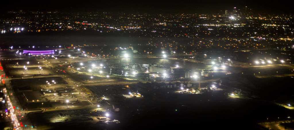 This shot looks northeast toward the downtown Los Angeles skyline, and you can see the Hollywood sign on the dark ridge at the left edge of the frame, below a bit of the plane’s wing. The blur at the bottom, across the parking lot, is from the plane’s engine exhaust. (One reason I prefer my windows forward of the wing.)