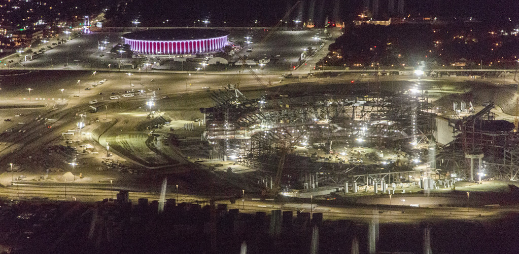 Here you SoFi’s superstructure is mostly framed up, and some of the seating is put in place. Here is a wider view shot two seconds later, after I zoomed out a bit: