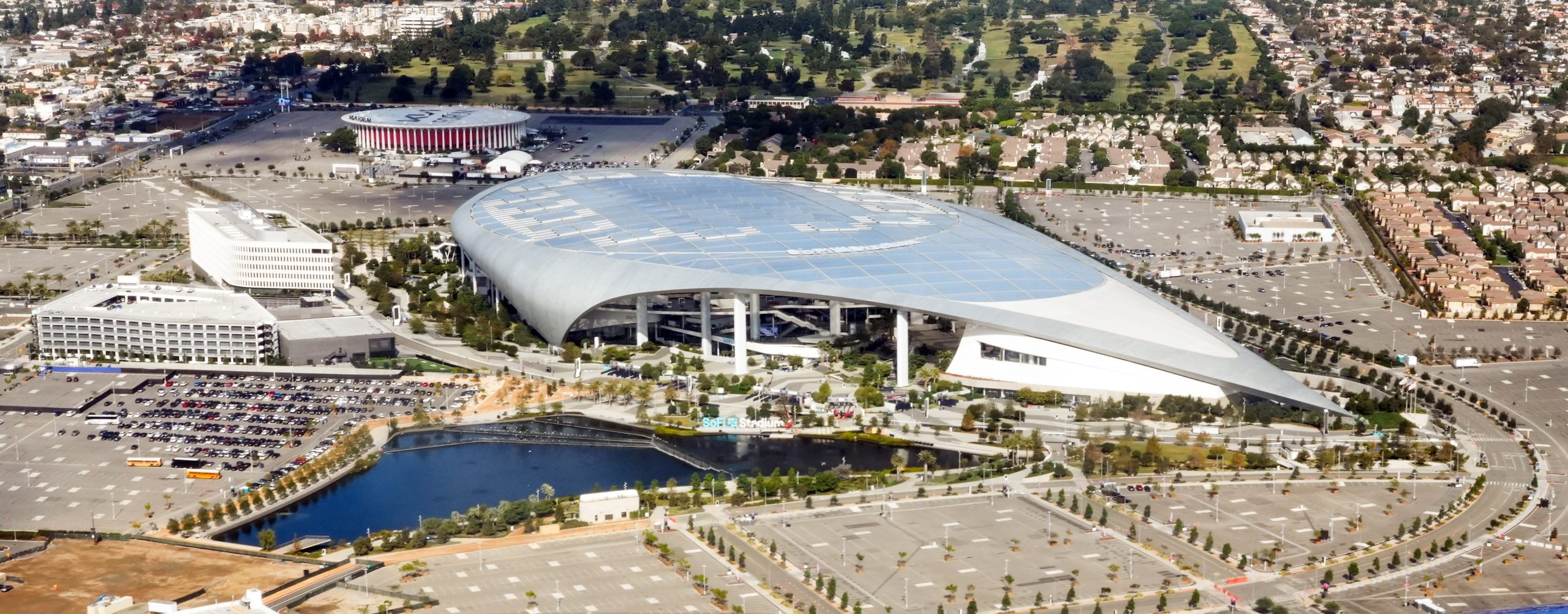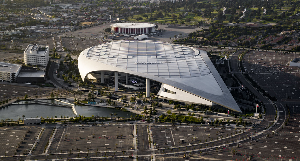 We see Rivers Lake, the office building, and its parking structure are also done, as are the parking lots around the stadium. You can also see “SoFi Stadium” in raised lettering on the roof.
