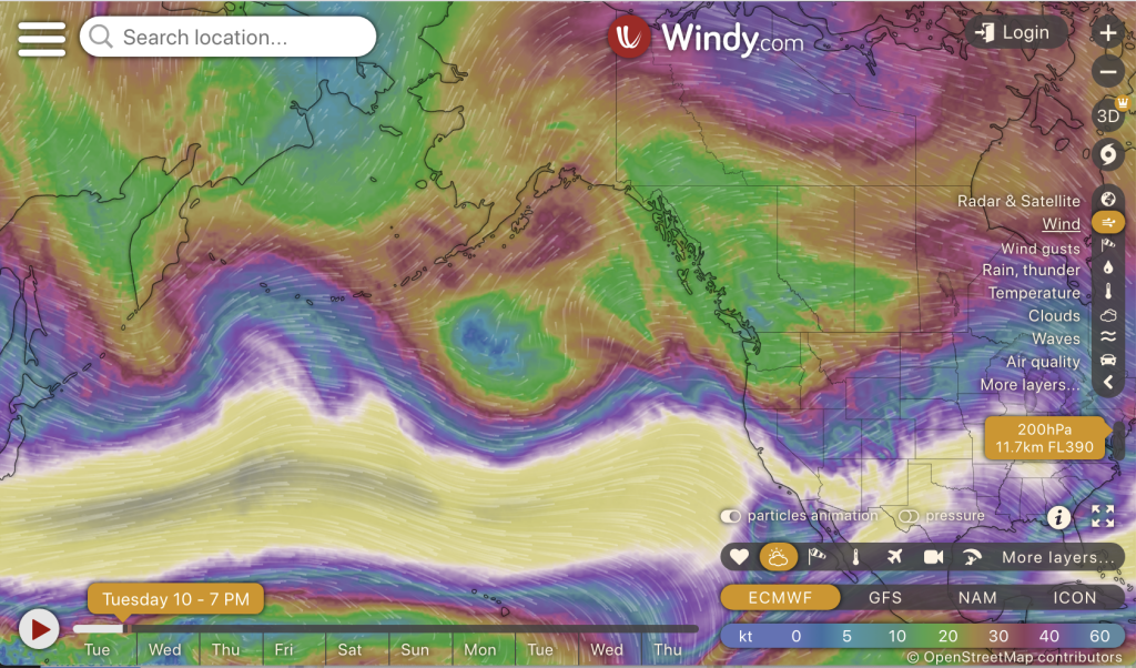 So that’s a long view. For one that spans the next week, visit windy.com and slide the elevation up to FL (flight level) 340 (34000 feet):