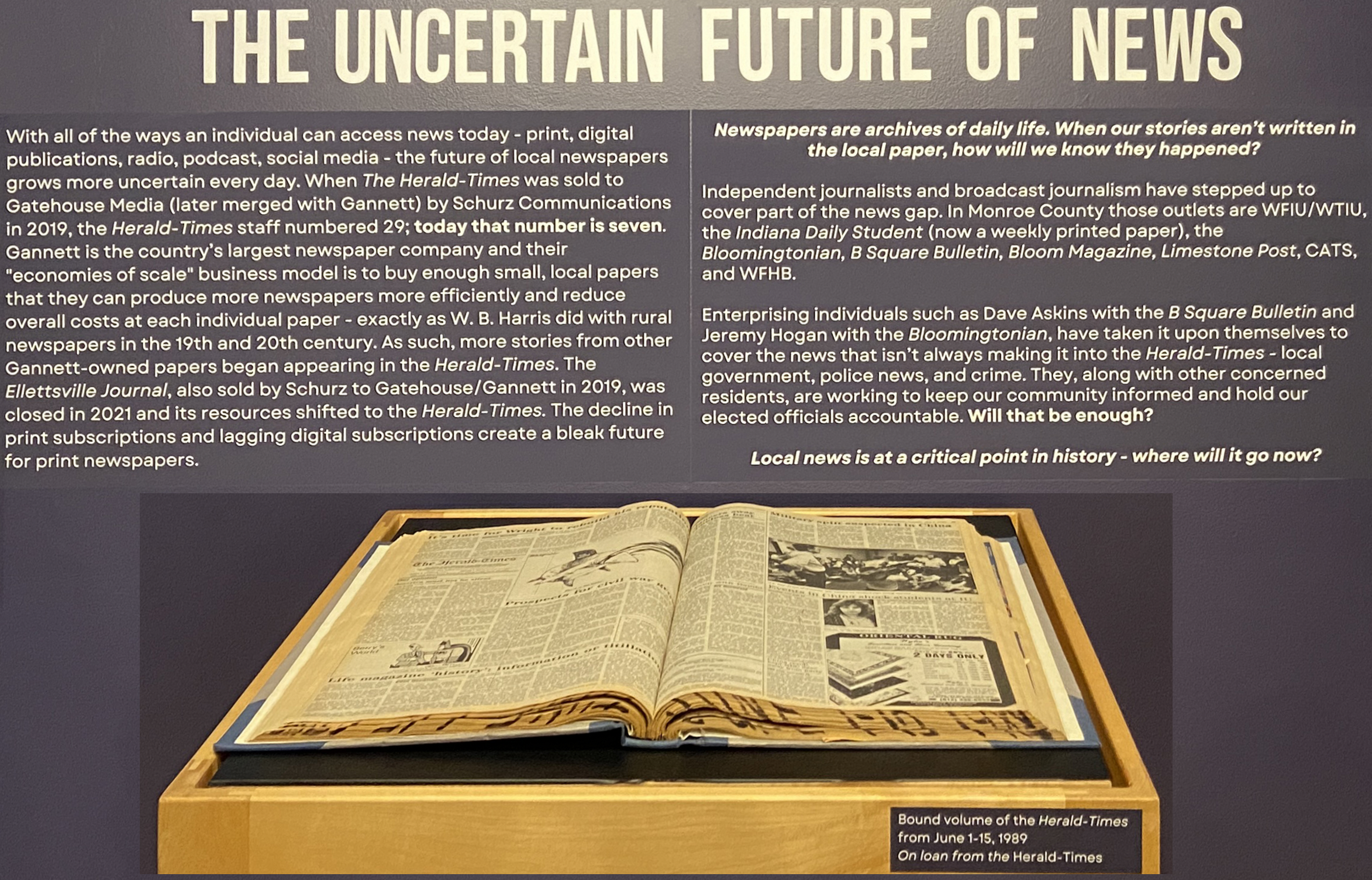 For more than a century, the information center that held a town or a city together was its newspaper. This is no longer the case. The Monroe Country History Center and the Herald-Times (our local paper) explain the situation in an outstanding exhibit at the Center’s museum called Breaking the News: