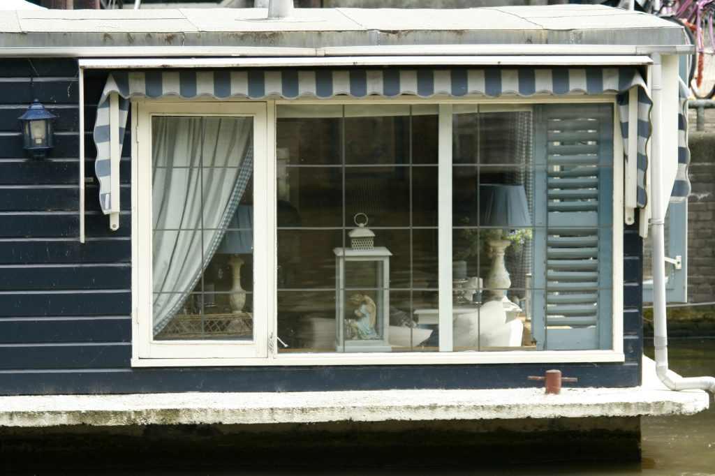 Looking into the windows of a living room in an Amsterdam houseboat floating on a canal.