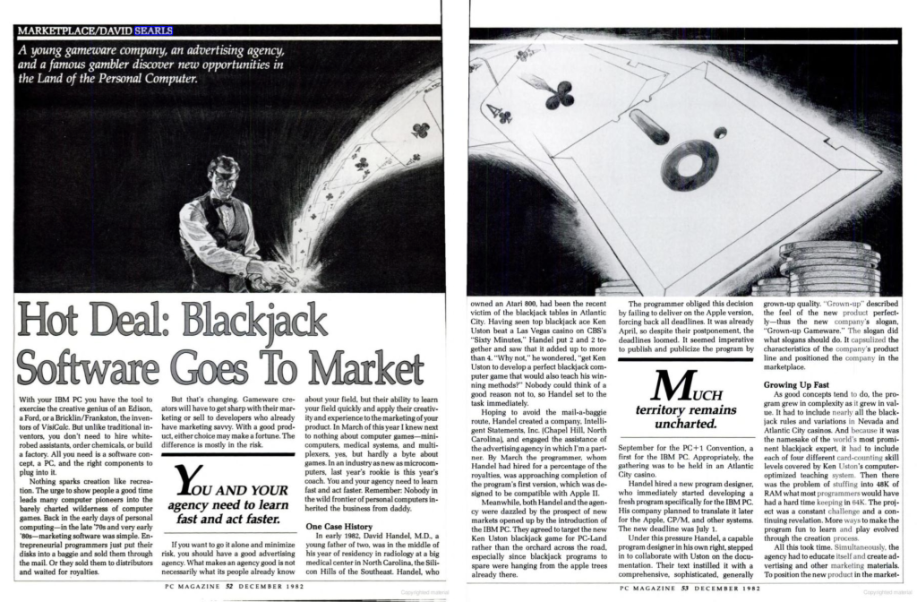 But hey, God bless the Internet Archive. Here’s a piece I wrote for PC Magazine in December 1982 about a PC application that taught card counting in blackjack: