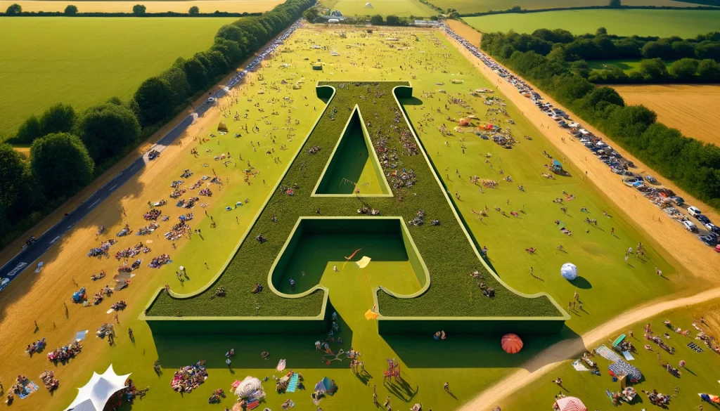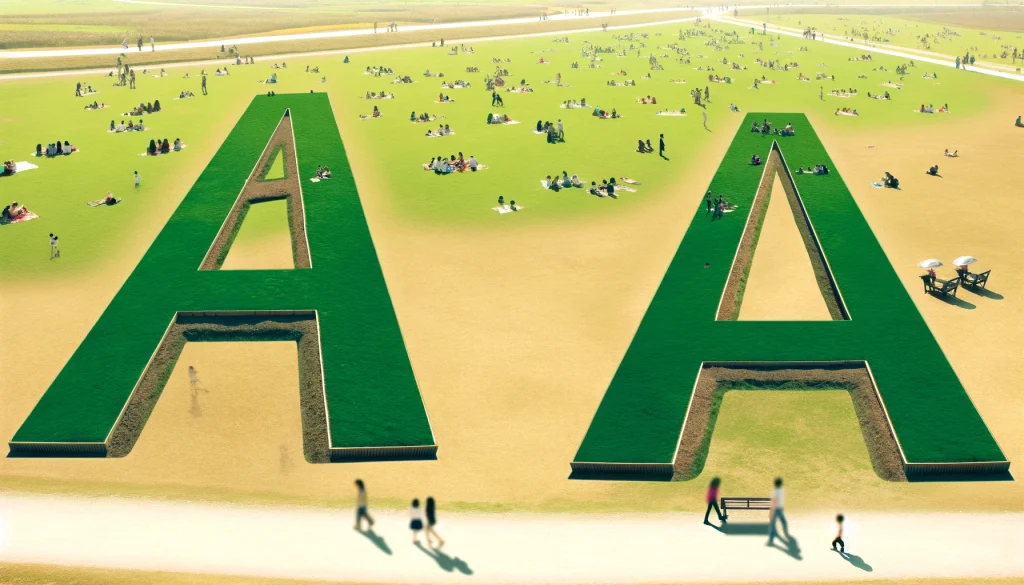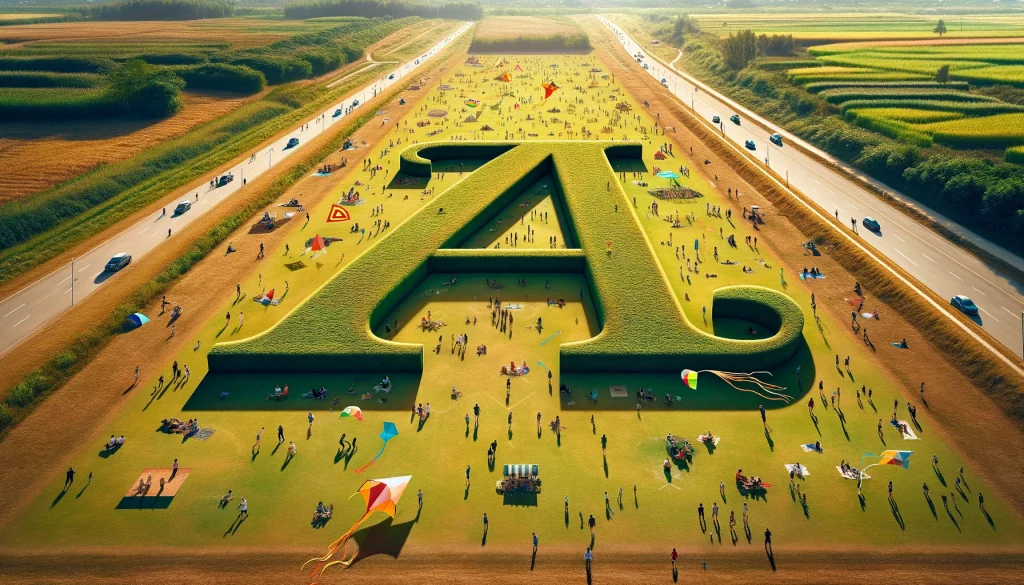 Here’s the updated illustration showing a vast open field creatively landscaped into two distinct uppercase ‘A’ letters, bustling with people enjoying various activities in a sunny, cheerful setting.
