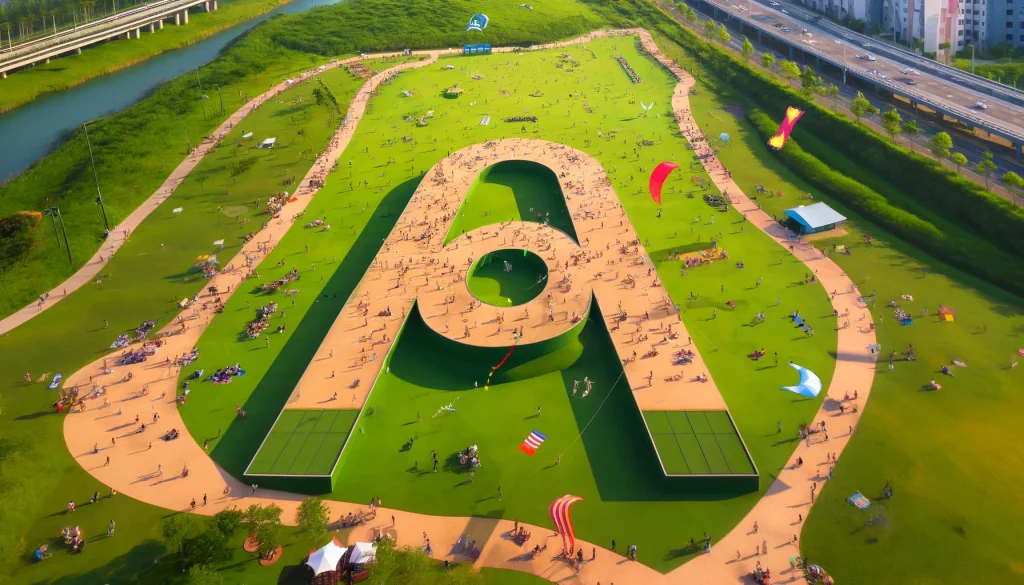 Here’s the illustration of a whimsical outdoor scene with a vast field shaped into the letters ‘A’ and ‘I’, where people are enjoying various activities, creating a cheerful and lively atmosphere.