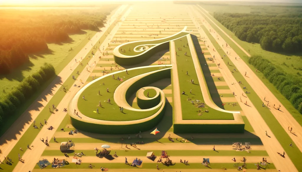 Here’s the updated illustration showing a vast open field creatively landscaped into the shapes of the uppercase letters ‘A’ and ‘I’, both with serifs. The field is surrounded by people enjoying various activities in a sunny, cheerful setting.
