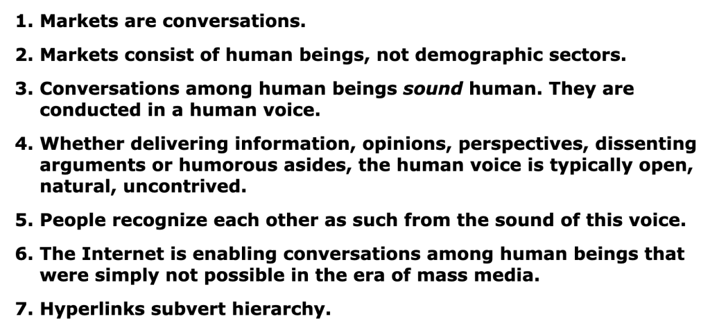 - Challenged traditional marketing: It criticized the “homogenized voice” of traditional business communication, encouraging a more authentic and conversational approach that social media later facilitated (link).