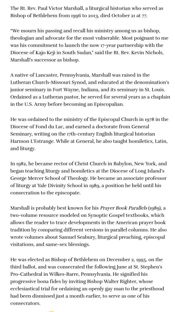 After high school, Paul went on to distinguished careers as a liturgical historian, a parish pastor, a professor at the Yale Divinity School, Bishop of the Episcopal Church’s Bethlehem Diocese in Pennsylvania, and an activist for progressive causes (notably in his church). Among other things. Our contacts through all those phases were always warm and fun.