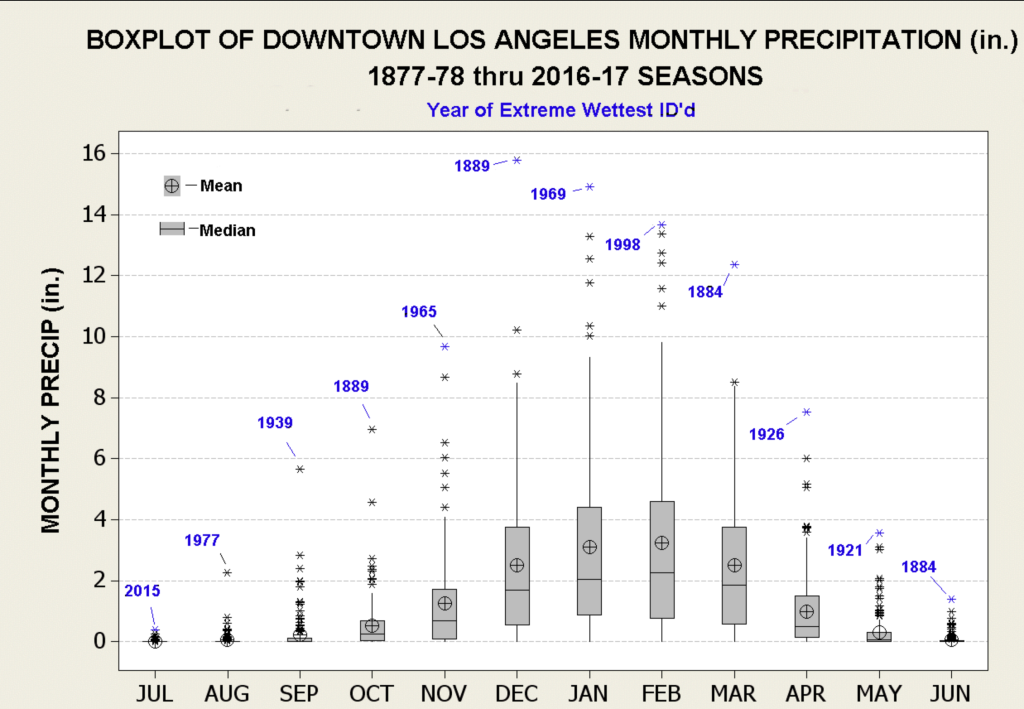 Southern California has two seasons: fire and rain. The fire season runs from the end of rain to the next rain. Winter is the rain season. Here is how rainfall usually looks: