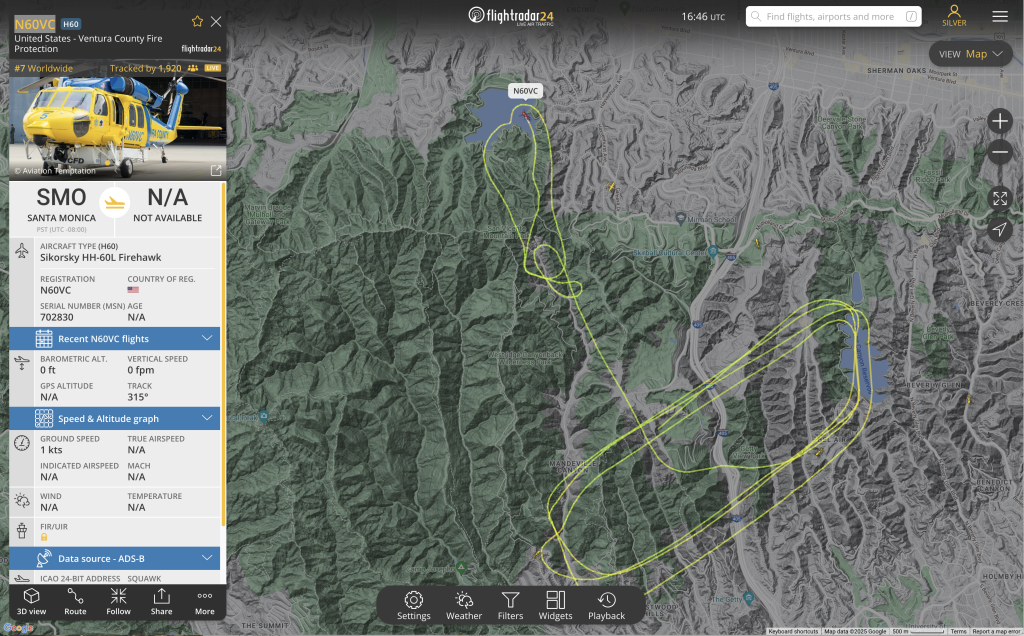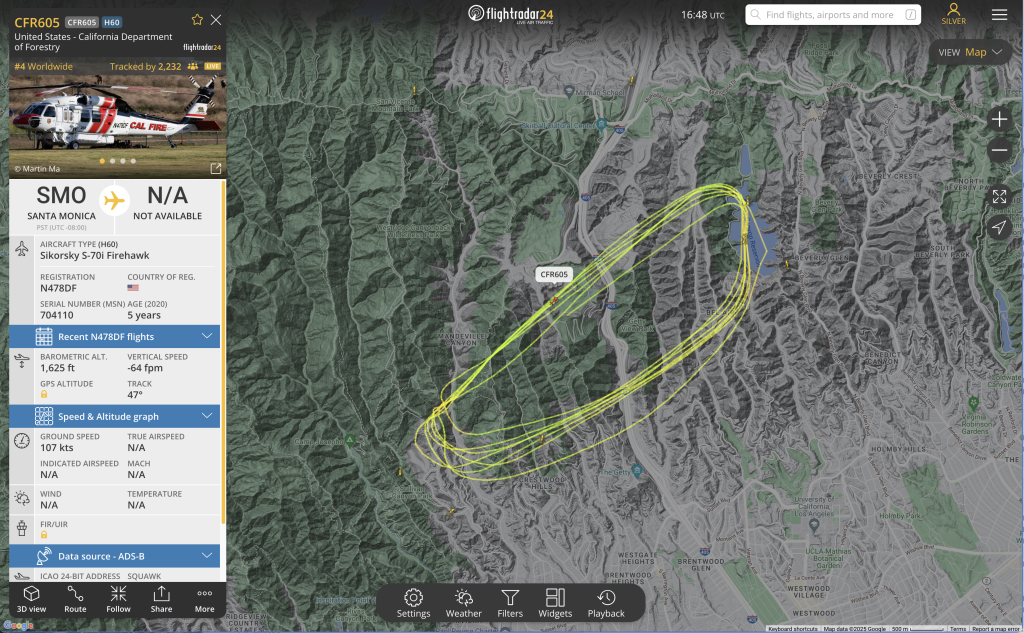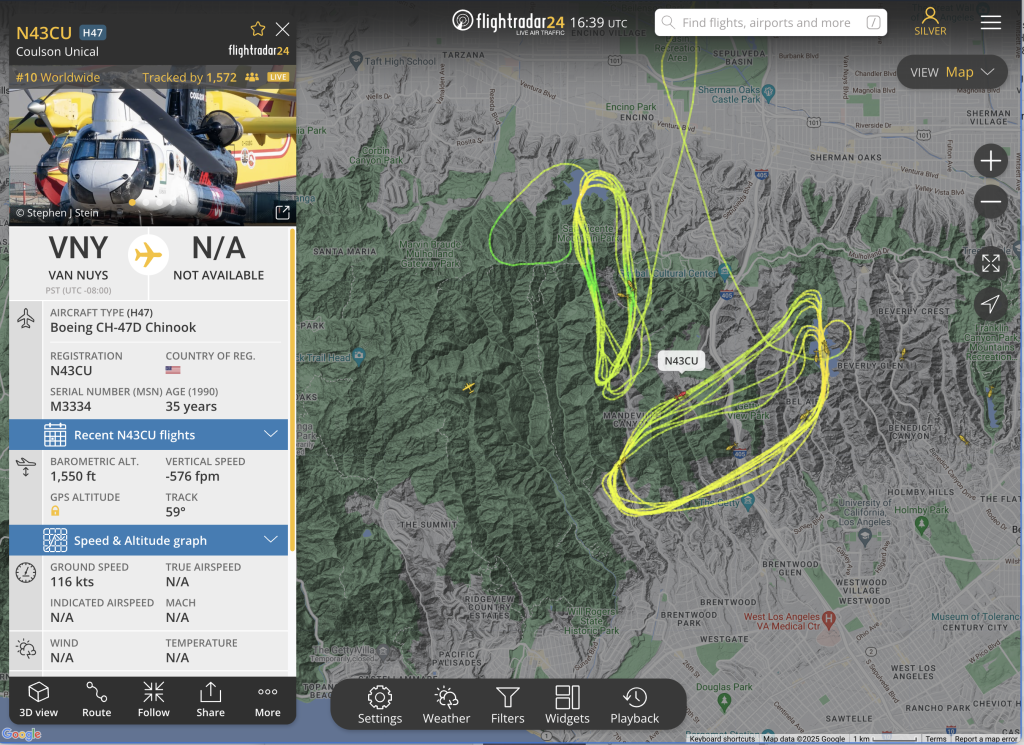 9:00am—The battle against wildfires in Los Angeles is almost entirely won by aerial firefighting. Helicopters and airplanes dropping water and retardants on fires and along perimeters saved Hollywood from the Sunset Fire two nights ago. They saved Encino from the Paradise Fire last night, and they are saving Brentwood right now. What we see above, thanks to KABC/7, is N43CU, a Boeing CH-47D Chinook, gathering water in Stone Canyon Reservoir to dump on the Palisades Fire in Brentwood. Here is its recent flight path, thanks to FlightRadar24:
