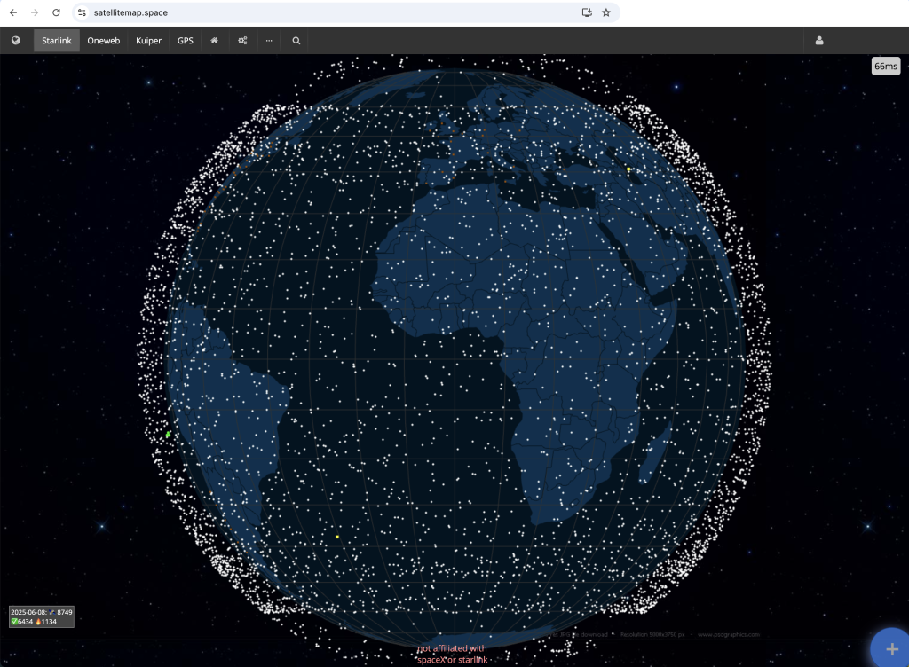 We’re covered. Zoom in to satellitemap.space. The vast majority of low Earth orbit satellites (all the white dots above) are Starlink’s. Play around with the tabs.