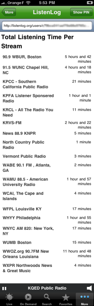 I should add that we had a trial run with a software project called ListenLog, which was a feature added to a phone app from PRX called the Public Radio Player. The idea was to show listeners what they actually listened to, and to provide an easy way for listeners to pay for the goods on a pro rata basis. At the top of this post is my log of listening while the project was active and funded, in 2010. It was waaay ahead of its time.