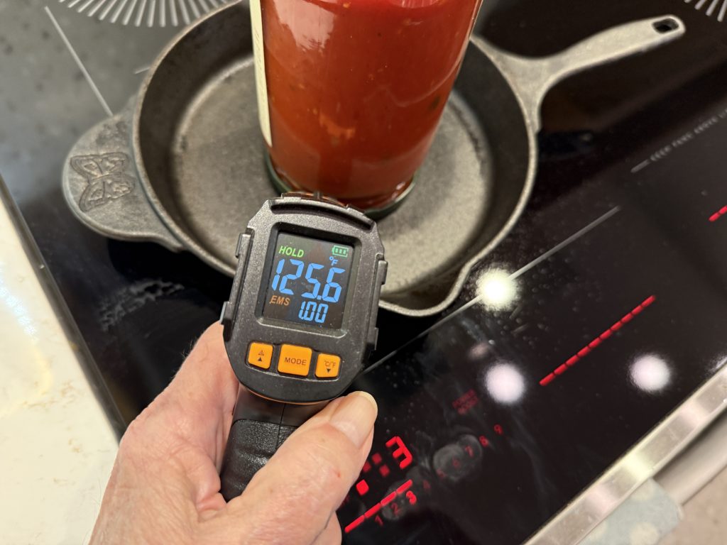 2. Wait until the surface gets to about 130°, then turn it to simmer, or the lowest possible value, so it holds that temperature. To check, use an infrared thermometer laser gun-like gizmo. They’re cheap online: less than $20, tariffs withstanding.