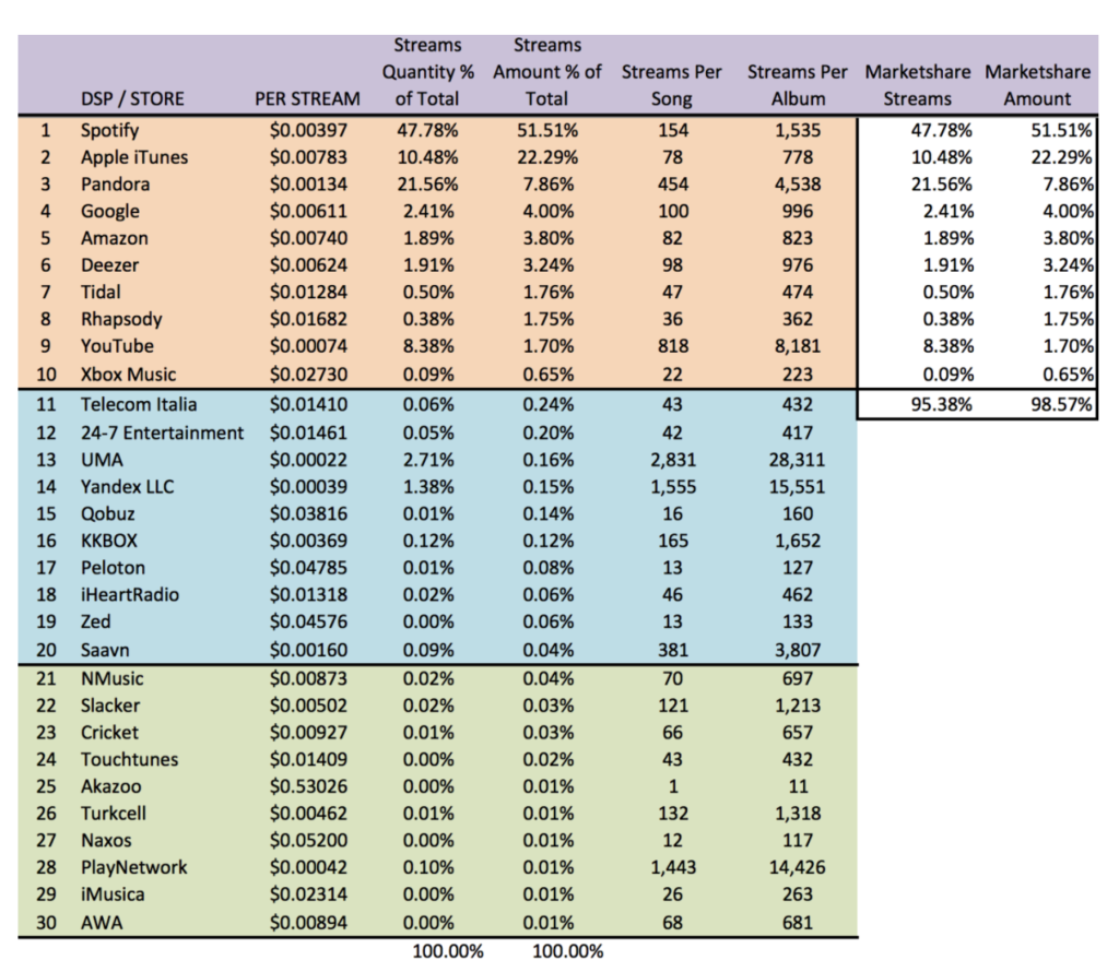 To make that clearer, the top three streamers pay between 13.4% (Pandora) and 78.3% of a penny (1¢) to play you a song.