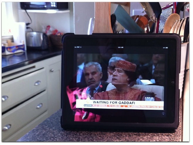 Al Jazeera English. Far as I know it’s the only serious TV that’s live, streaming 24/7/365 on the Net. I watch it on the iPad wherever we have it… in the car, on a cabinet in the bedroom, or — in this case — on the kitchen counter, next to the stove, where I was watching it while making breakfast yesterday morning. That’s when I shot the photo.